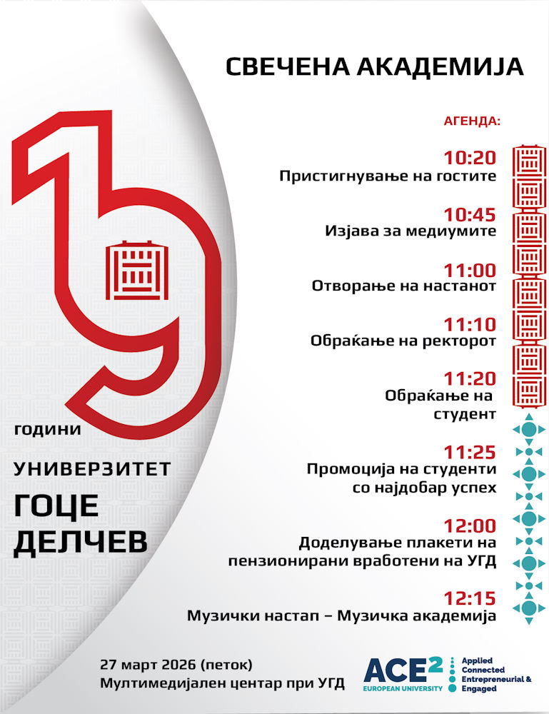 The Ceremonial Academy will be carried out with an appropriate artistic and formal program, official speeches, and the awarding of recognitions, as a sign of respect for the values, achievements, and continuous development of Goce Delcev University – Stip.